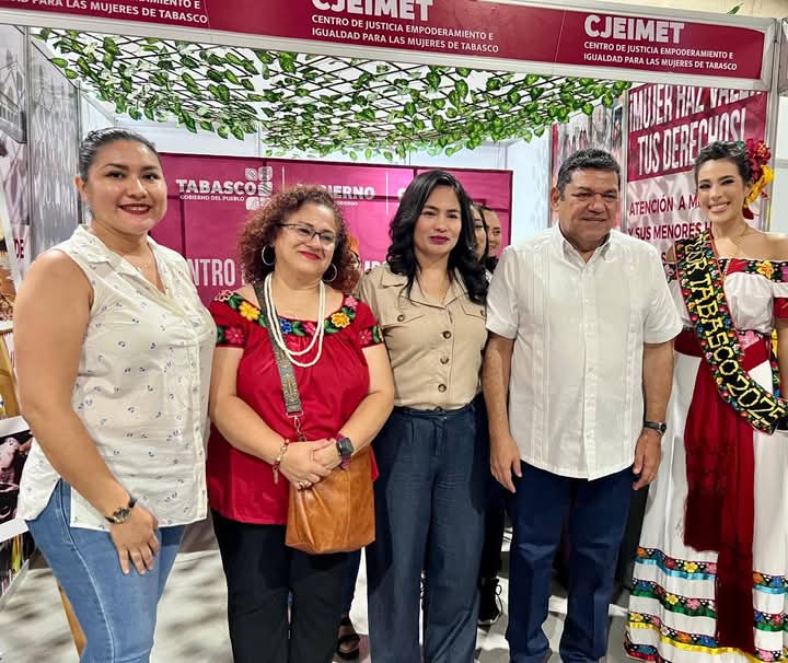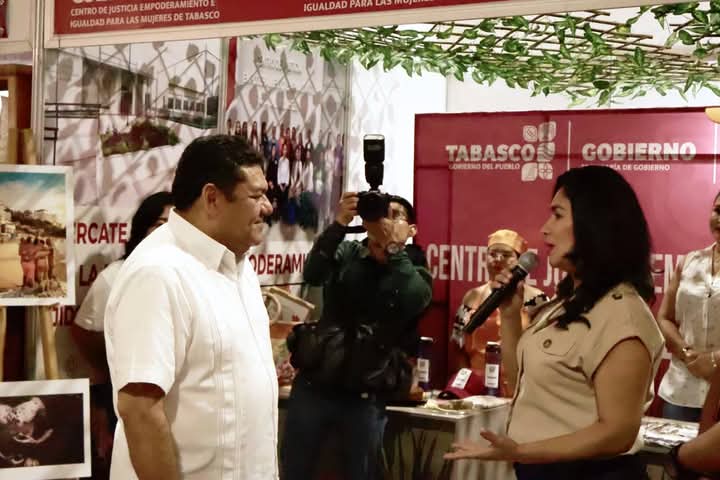Durante su recorrido, el gobernador Javier May Rodríguez visitó el stand del Centro de Justicia y Empoderamiento para las Mujeres del Estado de Tabasco (CJEIMET), donde la titular Saori Gallegos Alamilla le presentó los servicios que se brindan en apoyo a las mujeres y el fortalecimiento de sus derechos.