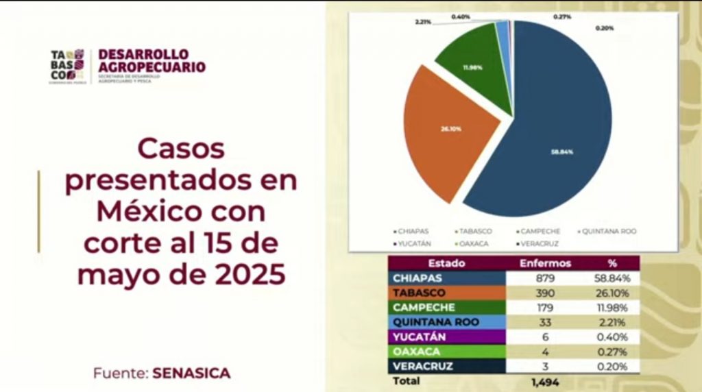 Se informó que, desde la detección del primer caso de gusano barrenador en noviembre de 2024 en Chiapas, la presencia del parásito se ha convertido en un tema prioritario para el sector agropecuario. A nivel regional, Chiapas registra 879 casos, Tabasco 390, Campeche 179, Quintana Roo 33, Yucatán 6, Oaxaca 4 y Veracruz 3, sumando un total de 1,494 casos en el sureste del país.