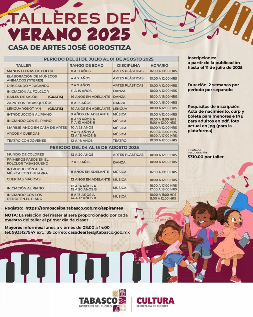 Los talleres disponibles son:- Elaboración de muñecos animados – Títeres – Sesión al folklore – Baile de salón – Introducción al piano – Teatro con jóvenes – Primeros pasos en el folclor – Introducción a la música con guitarraLas inscripciones ya están abiertas y el registro se realiza en línea a través de https://somosceiba.tabasco.gob.mx/aspirantes.