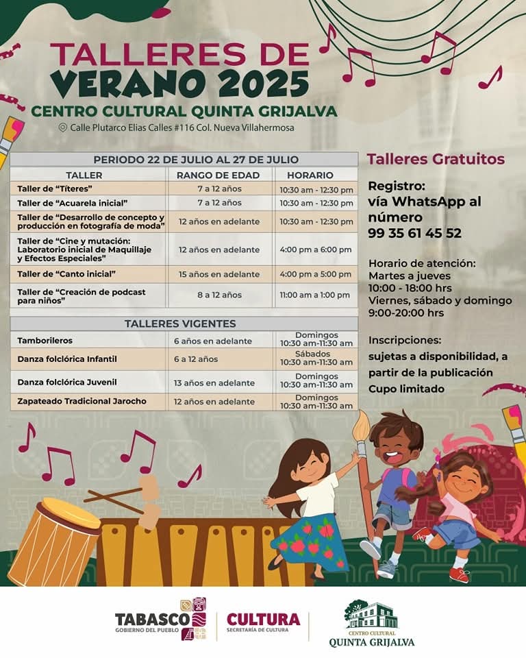 El Centro Cultural Quinta Grijalva, será espacio que ofrecerá una atractiva programación gratuita para el verano 2025, con talleres que incluyen:- Títeres – Acuarela inicial – Cine y laboratorio de maquillaje y efectos especiales – Canto inicial – Creación de podcast para niñas y niños – Tamborileros – Danza folklórica infantil – Danza folklórica juvenil – Zapatilla tradicional jarocha .