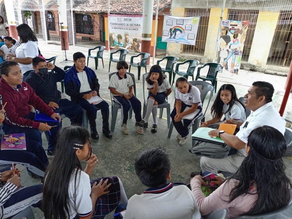 En esta actividad, los alumnos de la Telesecundaria Lic. Benito Juárez García, junto a su director, el profesor Concepción Olan Córdova, y estudiantes de la Escuela Primaria Gregorio Torres Quintero, disfrutaron de un encuentro dedicado al fomento de la lectura.