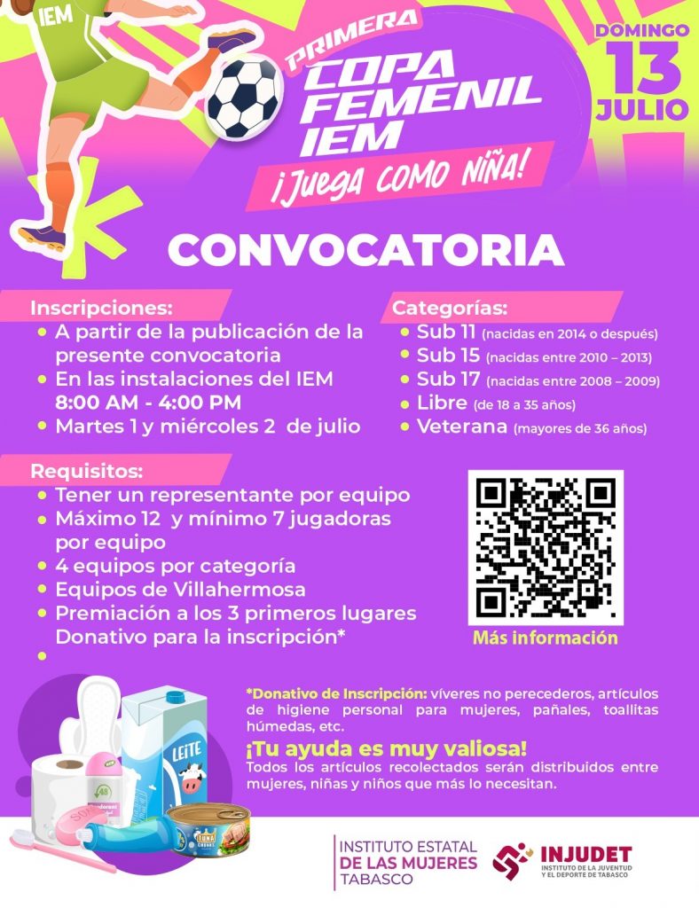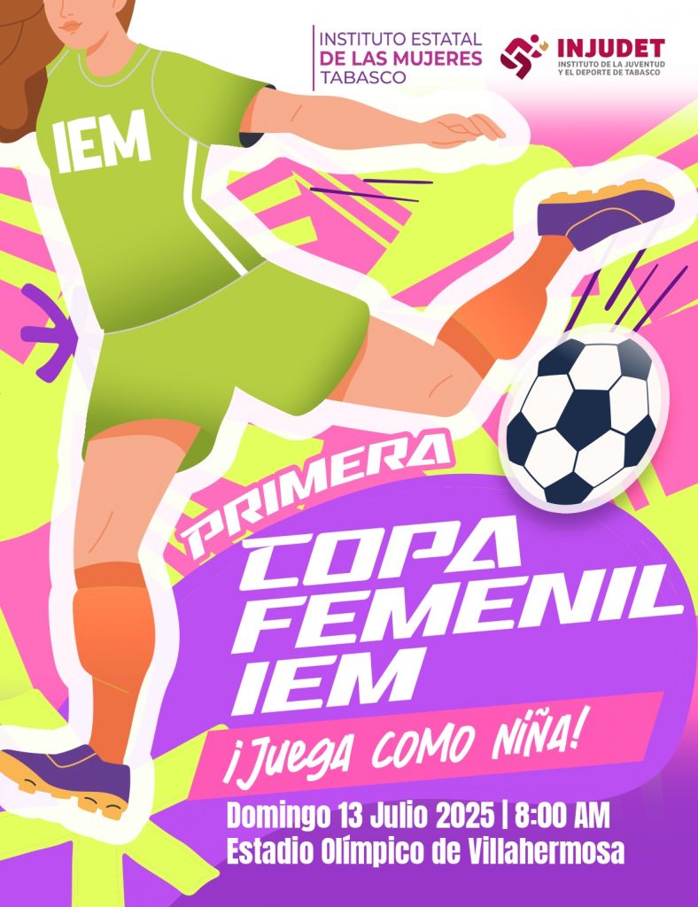 A fin de promover la actividad física, el deporte y la sana convivencia, el Gobierno del Pueblo a través del Instituto Estatal de la Mujer (IEM), invita a participar en la Primera Copa Femenil de Fútbol IEM 2025 ‘¡Juega como niña!’, que se llevará a cabo el domingo 13 de julio del presente año, a partir de las 8:00 de la mañana en el Estadio Olímpico de Villahermosa.
