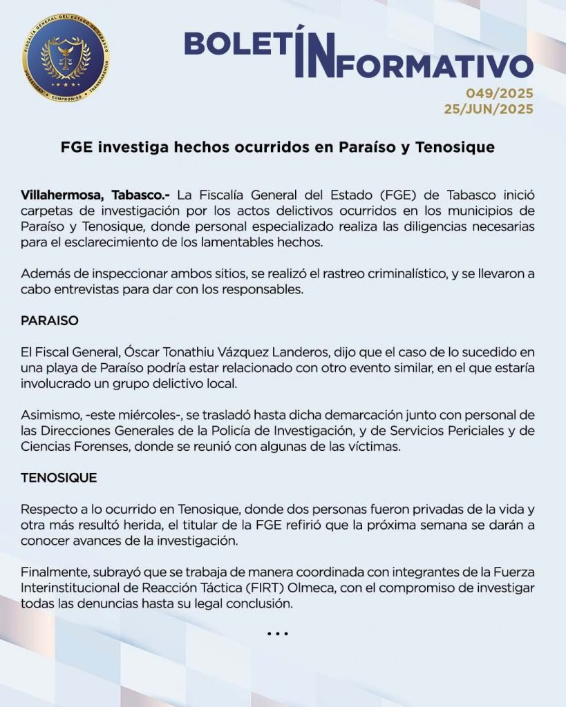 La Fiscalía del Estado de Tabasco informó que ya investiga los hechos ocurridos en Paraíso y Tenosique.