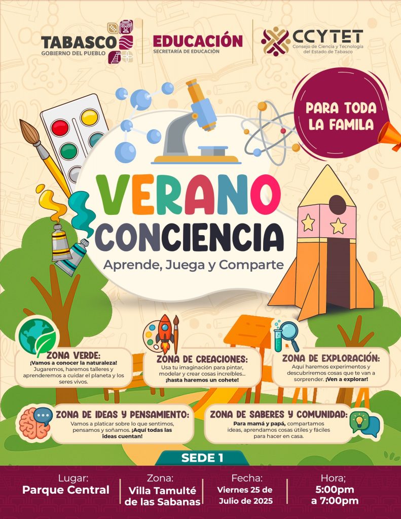 Se trata de «Verano Conciencia», un evento impulsado por el Consejo de Ciencia y Tecnología del Estado de Tabasco que busca combinar conocimiento, entretenimiento y convivencia comunitaria durante el periodo vacacional.