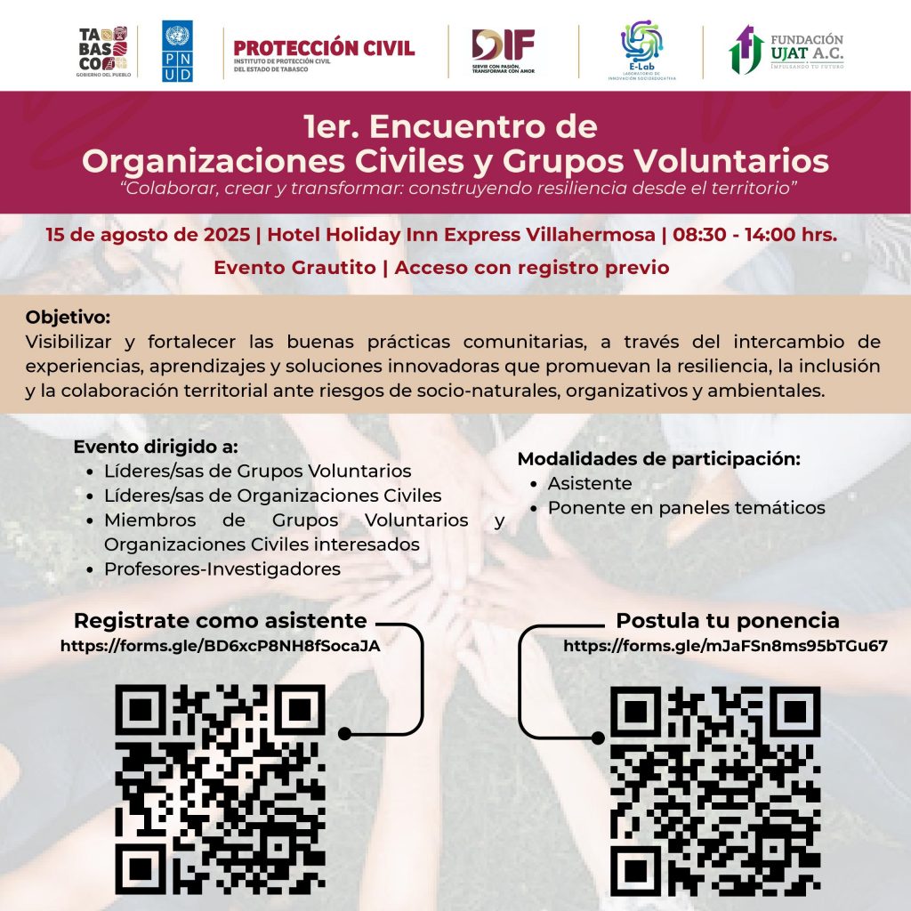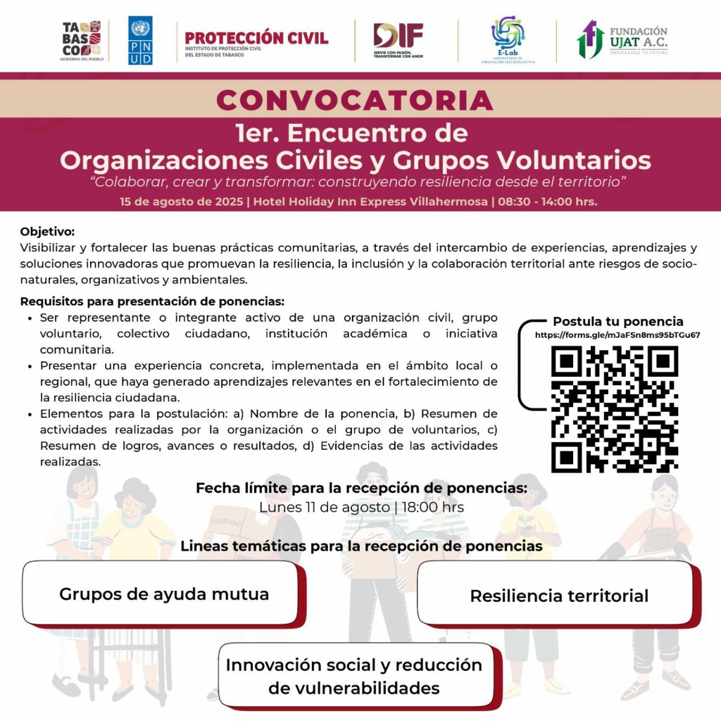 El Gobierno de Tabasco, en coordinación con el Instituto de Protección Civil, el Comité de Planeación para el Desarrollo (COPLADET) y el Programa de las Naciones Unidas para el Desarrollo (PNUD), lanzó una convocatoria dirigida a organizaciones civiles, colectivos ciudadanos, grupos voluntarios, académicos y representantes del sector privado para participar como ponentes en el Primer Encuentro de Organizaciones Civiles y Grupos Voluntarios.