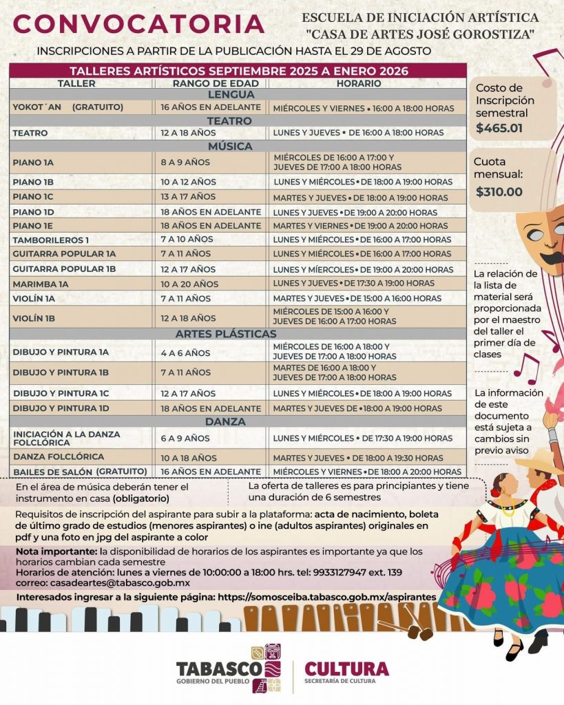 Informes al teléfono 993 312 7947 ext. 139 o al correo casadeartes@tabasco.gob.mxConsulta la convocatoria completa en: somosceiba.tabasco.gob.mx/aspirantes
