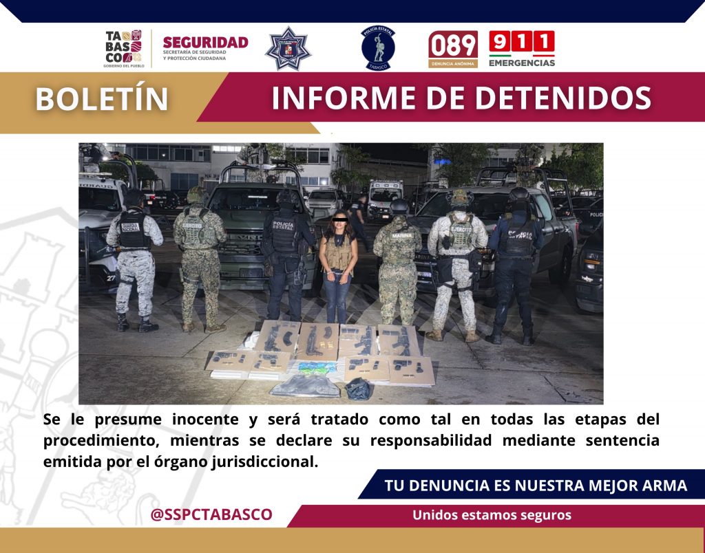 Como parte de la Estrategia Antiextorsión y del Plan de Contención del Delito desplegado por el grupo Especial Tabscoob en coordinación con elementos que integran la Fuerza Interinstitucional de Reacción Táctica (FIRT) Olmeca, se logró la detención de una femenina identificada como Luz Mayleth “N” de 26 años, por los delitos contra la salud y portación de armas de fuego de uso exclusivo de las Fuerzas Armadas.