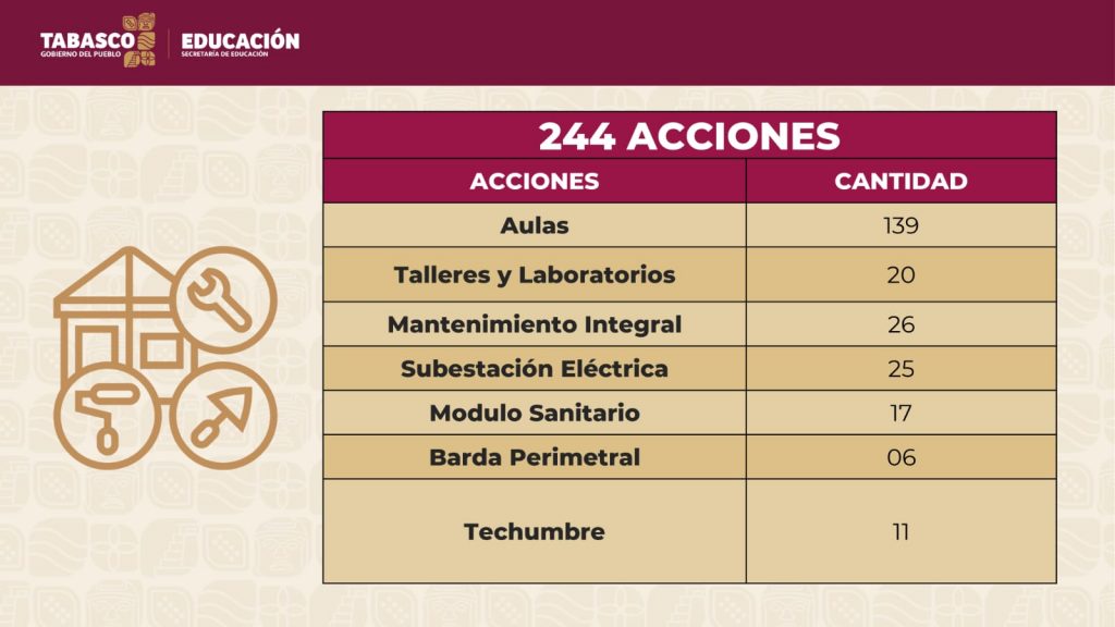 Dentro de las 244 acciones que, de acuerdo al servidor público, “son muestra clara de que las palabras no se quedan solo en el discurso sino que se demuestran con hechos”, se atenderán 139 aulas totalmente equipadas, 20 talleres y laboratorios totalmente equipados, 26 mantenimientos integrales en la infraestructura educativa de diversos planteles, 25 subestaciones eléctricas, 17 módulos sanitarios, 6 bardas perimetrales y 11 techados.