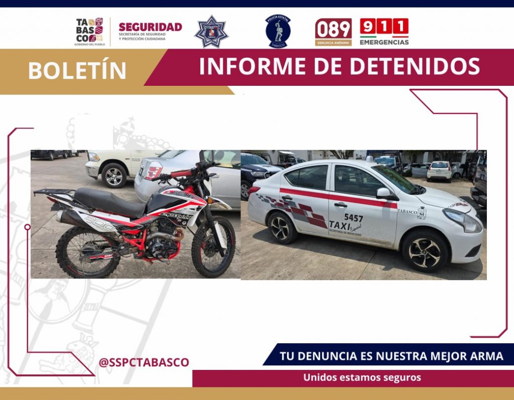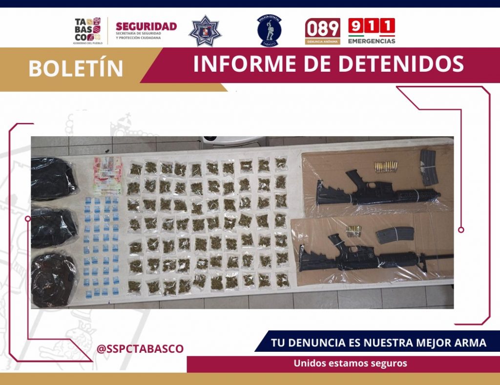 Al momento de su detención, las autoridades confiscaron armas largas, cargadores y cartuchos calibre .223. También se aseguraron varias bolsas con hierba seca con características similares a la marihuana y otra sustancia granulada parecida al cristal. Adicionalmente, se les encontró mil pesos en efectivo, una mariconera, un taxi Nissan 2022 del municipio de Centro y una motocicleta Vento de color blanco.
