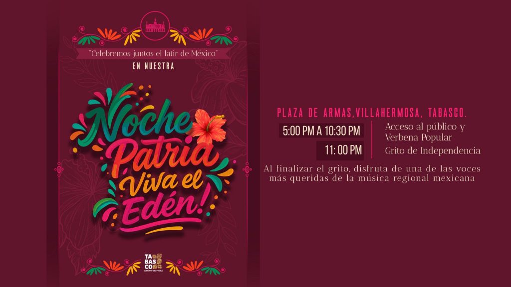 Añadió que el grito de Independencia a cargo del Gobernador Javier May está programado para las 23:30 horas, es decir una vez la Presidenta Claudia Sheinbaum Pardo haga lo propio desdel Zócalo de la Ciudad de México.