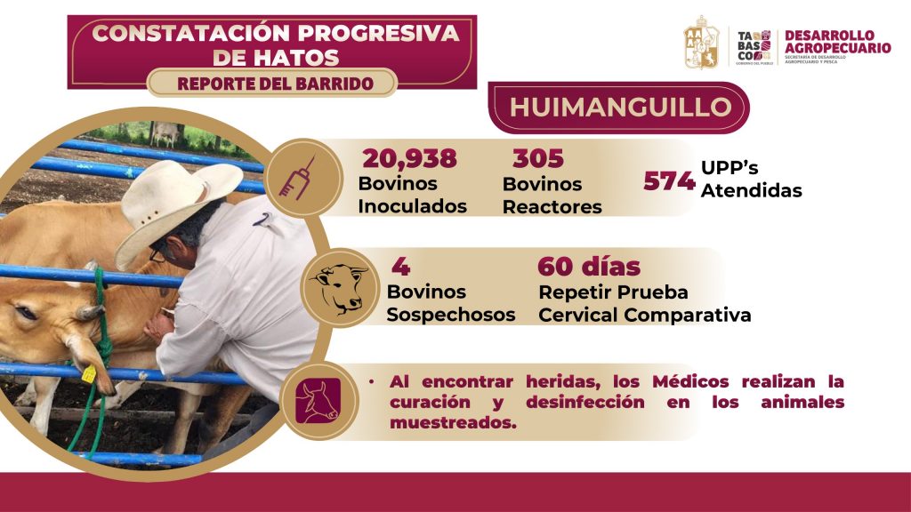 Agregó que, a través del barrido sanitario, hasta el día de hoy se han inoculado 20 mil 938 animales de 574 unidades de producción, punto en el que resaltó que el gobierno que encabeza Javier May está comprometido con la sanidad animal del estado, “porque ningún otro estado de la República invierte tanto en la materia para recuperar el estatus A”.