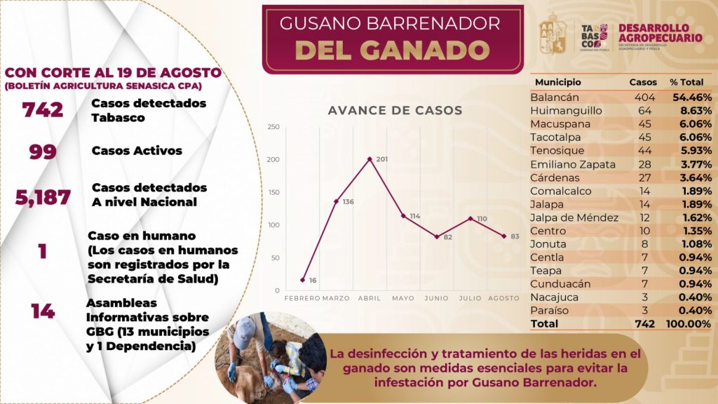 En el tema de movilización de ganado, expuso que se tienen tres fronteras, una con Guatemala, otra con Chiapas y en el Paralelo 18 para revisar exhaustivamente a los animales. En Catazajá, Chiapas, el ganado se inyecta con Ivermectina y se revisa para que no avance el gusano barrenador en la región.