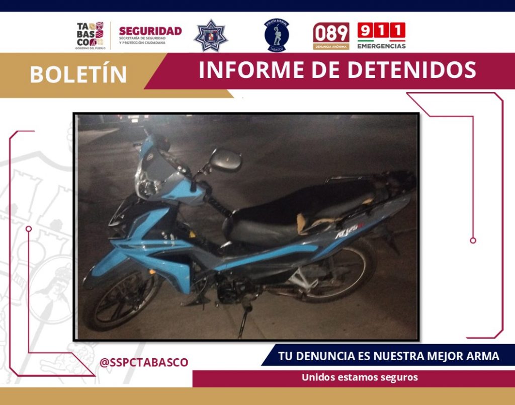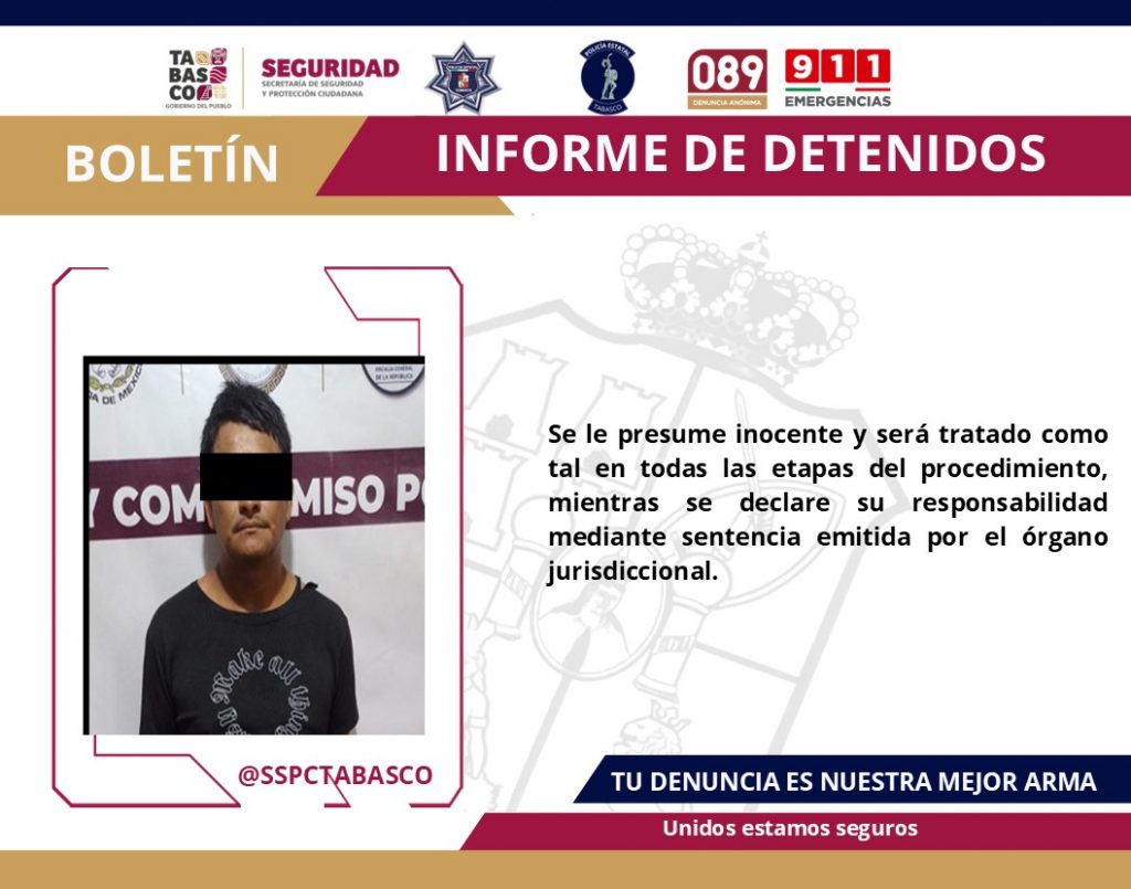 La Secretaría de Seguridad y Protección Ciudadana (SSPC) de Tabasco, en colaboración con el Grupo Especial Tabscoob y la Fuerza Interinstitucional de Reacción Táctica (FIRT) Olmeca, detuvo a un hombre en el municipio de Centla.