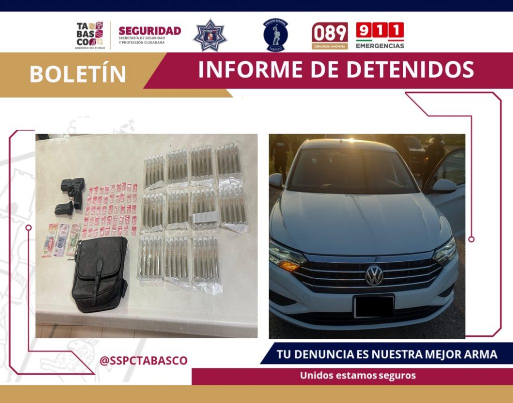 Durante el operativo, las autoridades les aseguraron: Un vehículo Jetta blanco con reporte de robo, un arma corta marca Taurus de 9mm con 10 cartuchos útiles, bolsas con lo que parece ser “cristal” y tubos de marihuana, dinero en efectivo.
