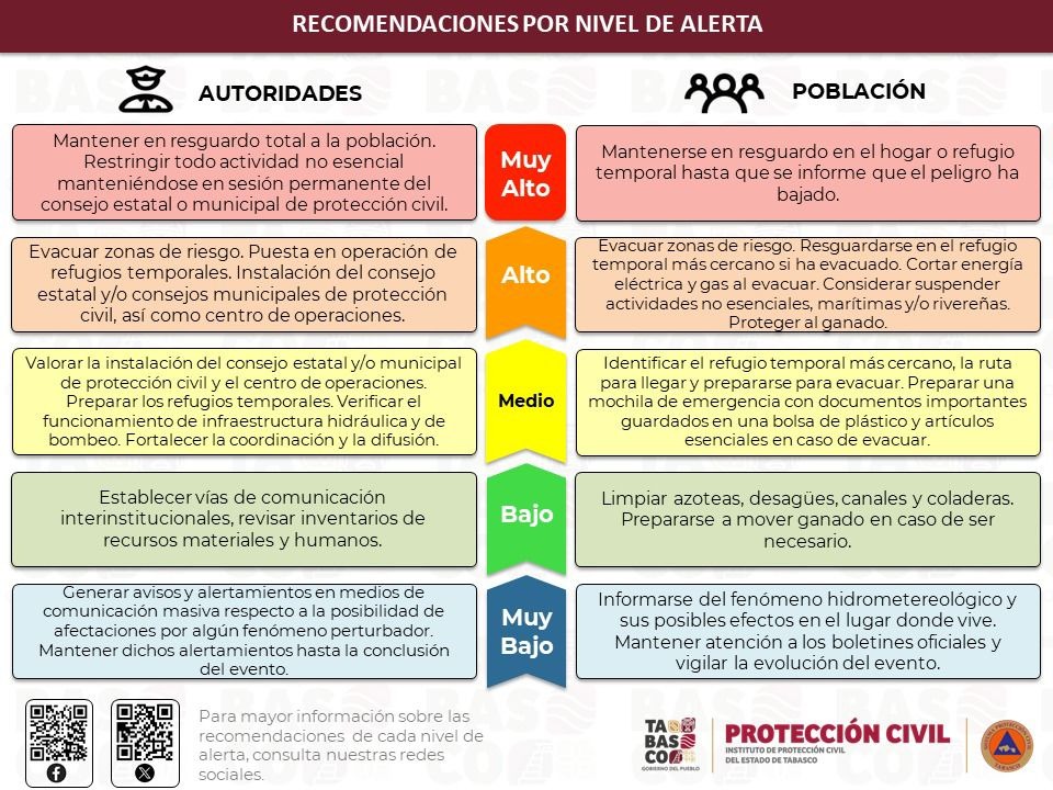 Señala que, los posibles efectos serían desbordamientos en zonas bajas, de muy alto riesgo o aledañas al río Samaría en Nacajuca, Jalpa de Méndez y en menor medida Cunduacán a partir de la noche de hoy y madrugada de mañana sábado 04 de octubre, con posibles descensos hasta la madrugada del domingo 05 o mañana del lunes 06.