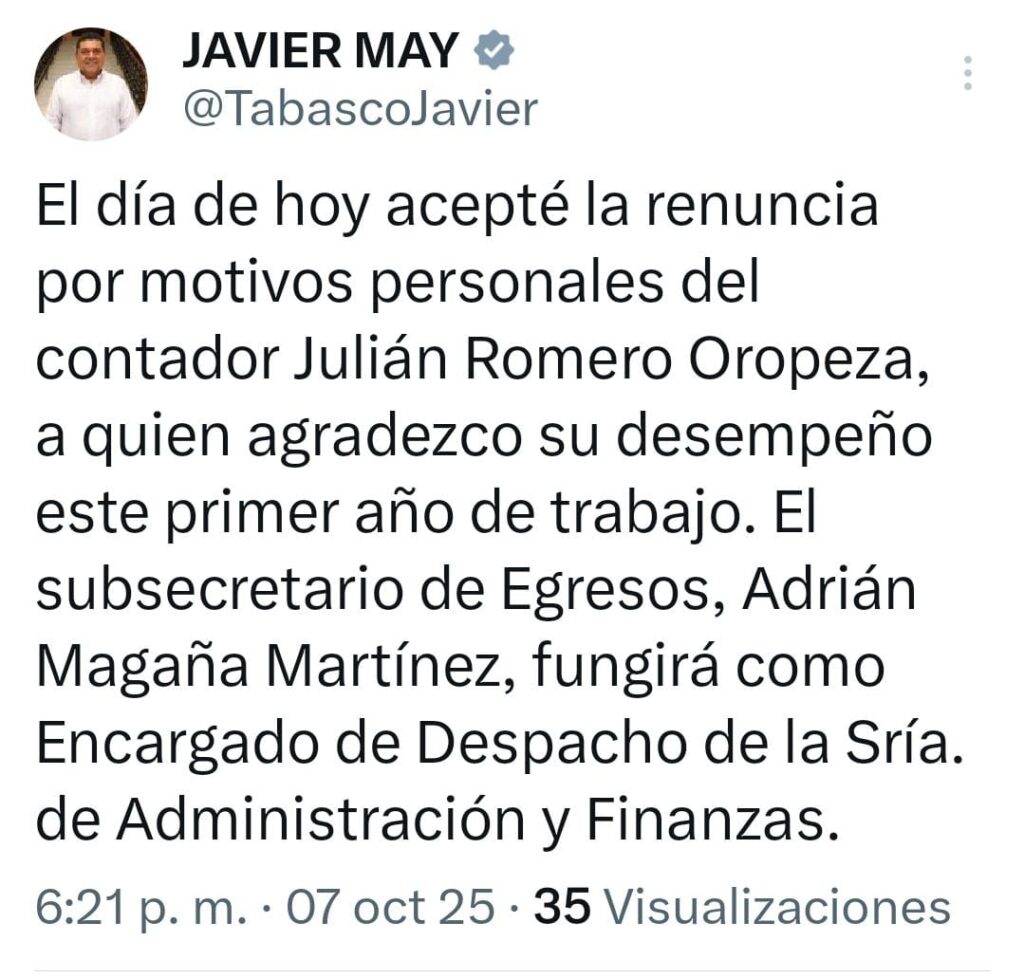 A través de sus redes sociales el gobernador de Tabasco, Javier May Rodríguez, dio a conocer que aceptó la renuncia por motivos personales del contador Julián Romero Oropeza, quien se desempeñó como titular de la Secretaría de Administración y Finanzas durante el primer año de su administración.