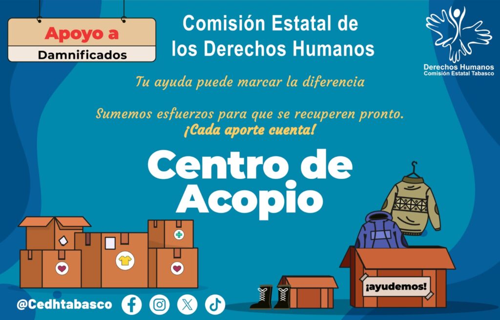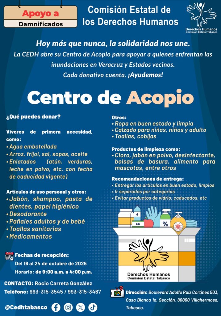Ante las afectaciones provocadas por las recientes inundaciones del país, la Comisión Estatal de los Derechos Humanos (CEDH) de Tabasco ha abierto un centro de acopio para reunir víveres y artículos esenciales destinados a las comunidades afectadas.