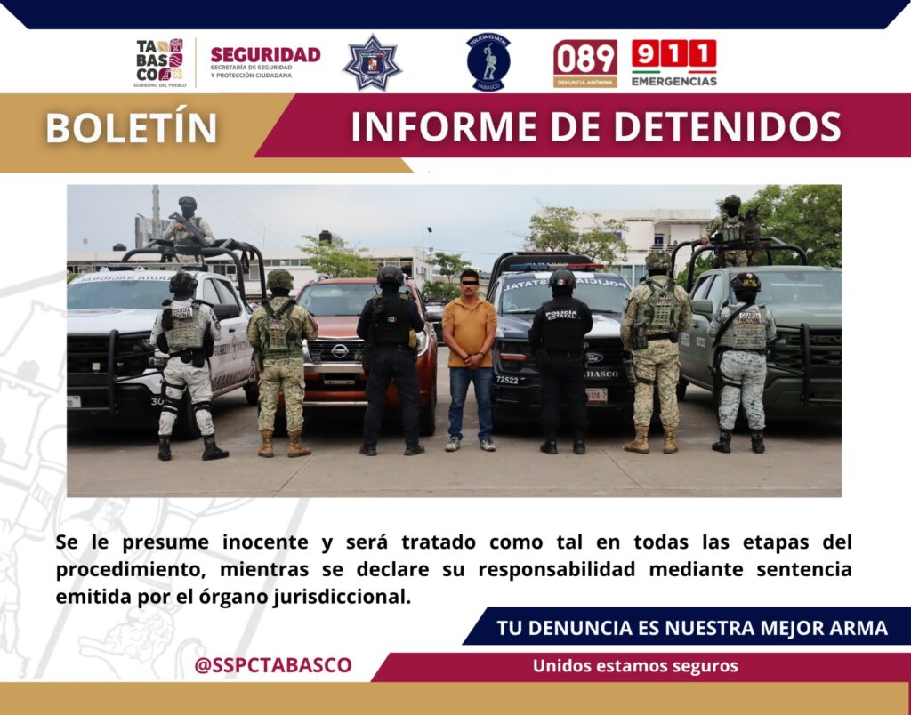 Como parte de la Estrategia Antiextorsión y del Plan de Contención del Delito, la Secretaría de Seguridad y Protección Ciudadana de Tabasco (SSPC) en coordinación con la Fuerza Interinstitucional de Reacción Táctica (FIRT) Olmeca, llevaron a cabo la detención de un masculino por su probable responsabilidad en el delito de Robo Equiparado de Vehículo.