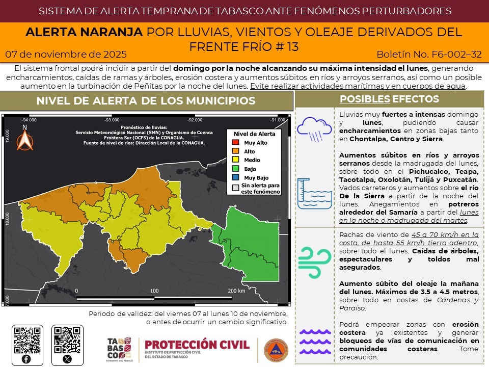 Se prevén lluvias muy fuertes a intensas, acompañadas de rachas de viento de 45 a 70 km/h en la franja costera y de hasta 55 km/h tierra adentro, además de un notorio incremento en el oleaje, con alturas de 3.5 a 4.5 metros, especialmente frente a las costas de Cárdenas y Paraíso. Estas condiciones podrían agravar zonas con erosión costera existente y afectar caminos o accesos a comunidades costeras, por lo que se exhorta a evitar actividades marítimas y en cuerpos de agua.