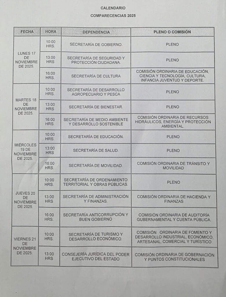 “La idea que tengamos dos sesiones en pleno de los secretarios empezamos el día lunes con el secretario de Gobierno a las 10 de la mañana estará por acá, a la una de la tarde el Secretario de Seguridad y Protección Ciudadana esos dos vienen al pleno, la secretaria de Cultura viene a comisiones a las 4 de la tarde el mismo lunes; el día martes a las 10 de la mañana tenemos a la secretaria de Desarrollo Agroprecuario y Pesca que viene al pleno, a la secretaria del Bienestar que viene al pleno, a la secretaria de Medio Ambiente a las 4 de la tarde que viene a comisión, de ahí el día miércoles a las 10 de la mañana la secretaria de Educación, a la una de la tarde el secretario de Salud, a las 4 de la tarde el secretario de Movilidad que viene a comisión”.