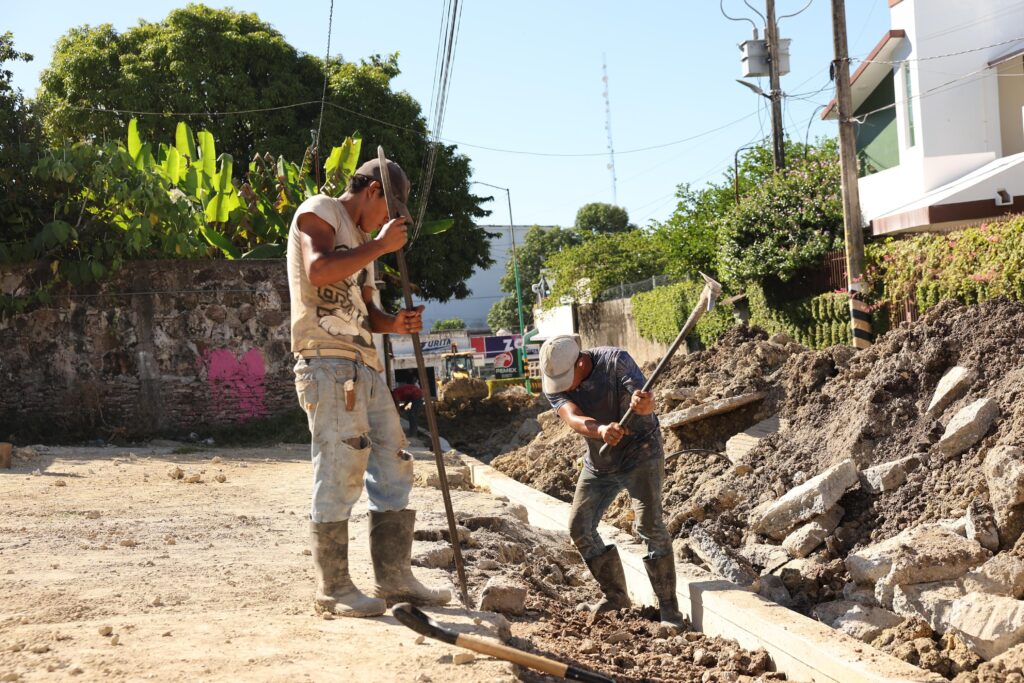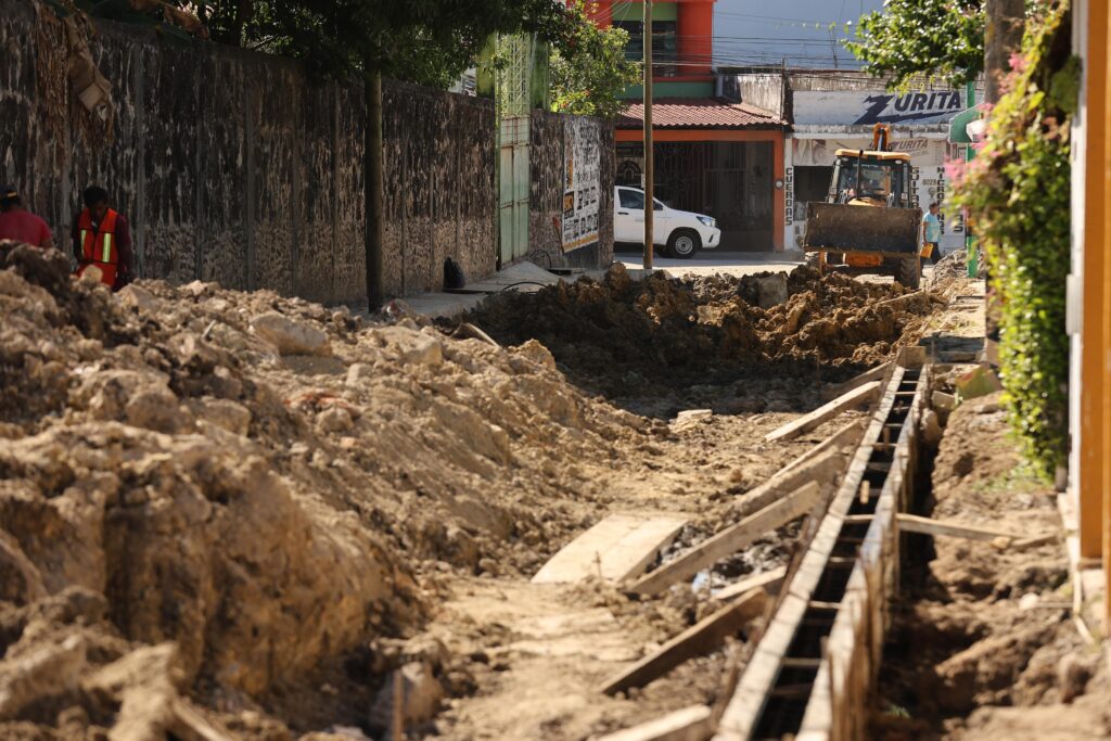 La obra contempla la colocación de tubería tipo PVC hidráulico, tomas de agua potable domiciliarias, pozos de visita, registros sanitarios, además de banquetas, guarniciones, postes y luminarias tipo led.