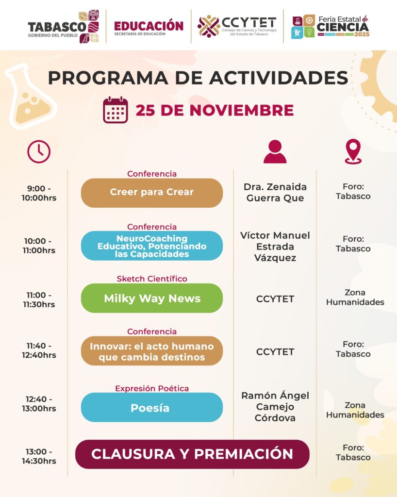 La clausura y premiación se realizará el 25 de noviembre, a partir de las 13:00 horas en el Foro Tabasco, donde autoridades estatales reconocerán el esfuerzo, la creatividad y el compromiso de las y los participantes.