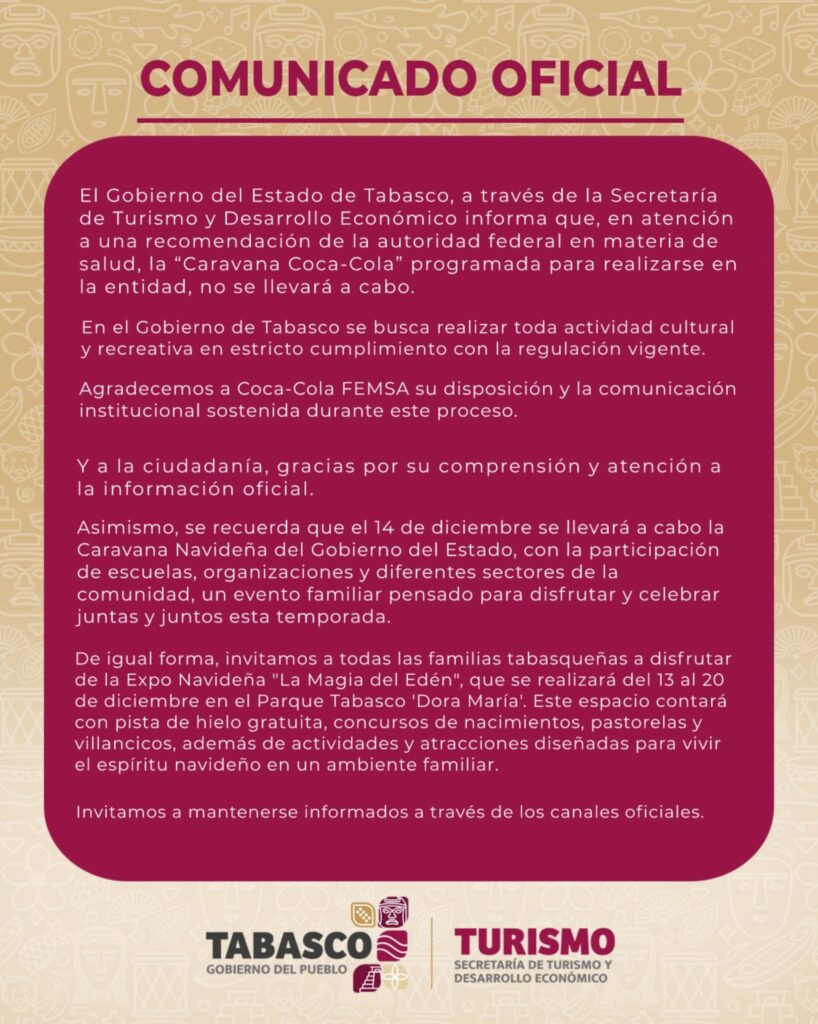 El Gobierno del Estado de Tabasco informó que la “Caravana Coca-Cola”, prevista para realizarse próximamente en la entidad, quedó cancelada atendiendo una recomendación emitida por la autoridad federal en materia de salud.