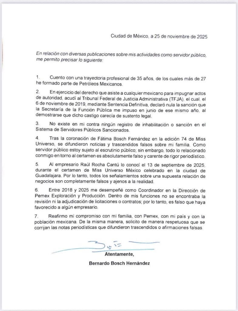 Finalmente, Bosch Hernández reafirmó sque el compromiso es con su familia, con Pemex y con México, y solicitó la corrección de notas periodísticas que difundieron información falsa sobre su persona.
