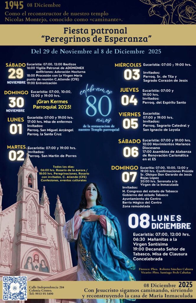 .Del 29 de noviembre al 8 de diciembre de 2025 se llevará a cabo la Fiesta Patronal “Peregrinos de Esperanza” en la parroquia de María Inmaculada Concepción, en el barrio de Conchita, con motivo de los 80 años de la restauración del templo parroquial.