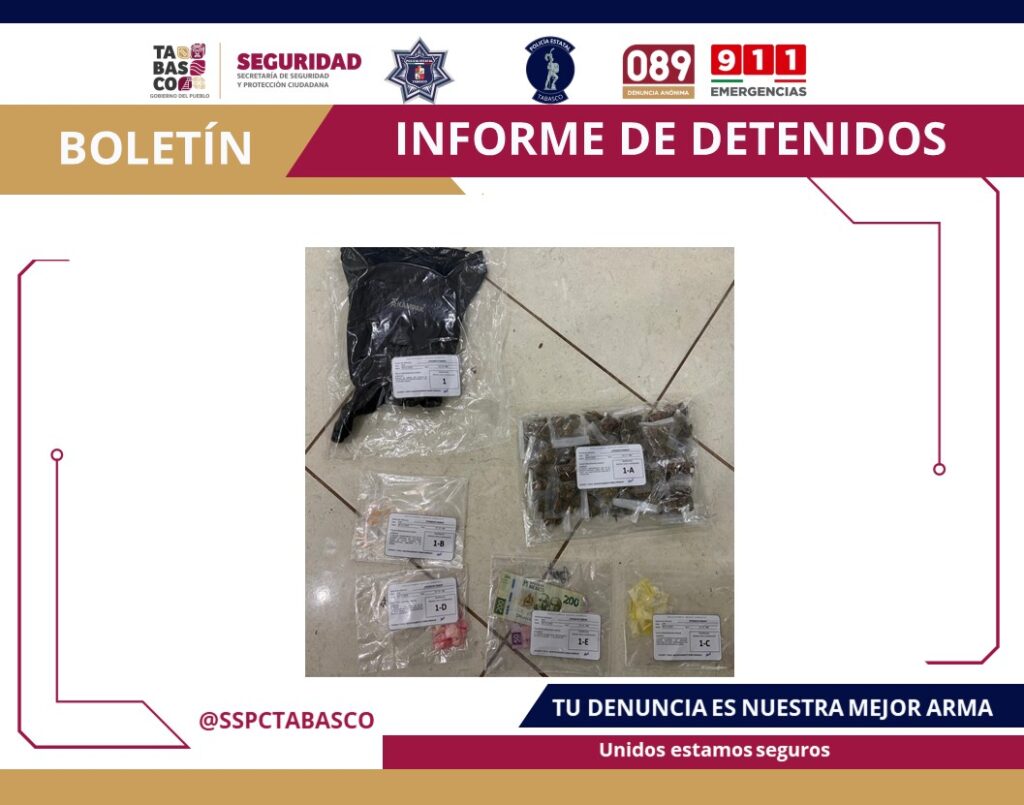 Los hechos ocurrieron en la calle Juventud, de la colonia Delicias, en el municipio de Centro, donde fue detenido Guillermo “N”, de 38 años. Durante la inspección, los agentes le aseguraron varias bolsitas transparentes que contenían: