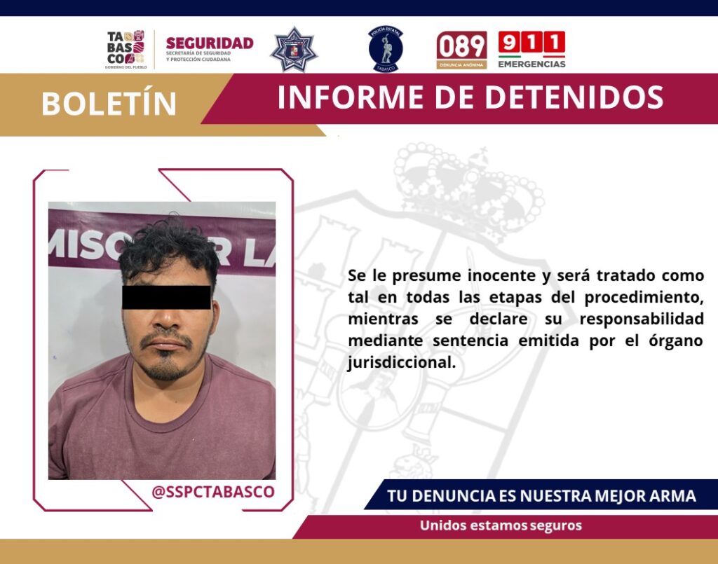 La Secretaría de Seguridad y Protección Ciudadana (SSPC) aseguró a un masculino como presunto responsable de delitos contra la Ley General de Salud, durante un operativo realizado en coordinación con elementos de la Fuerza Interinstitucional de Reacción Táctica (FIRT) Olmeca.