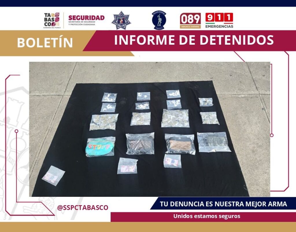 Durante la intervención, a las personas detenidas se les aseguraron bolsitas de plástico transparente que contenían hierba seca con características similares a la marihuana, así como bolsitas con una sustancia sólida transparente con características de metanfetamina conocida como “cristal”. También se decomisó dinero en efectivo y cuatro mariconeras.
