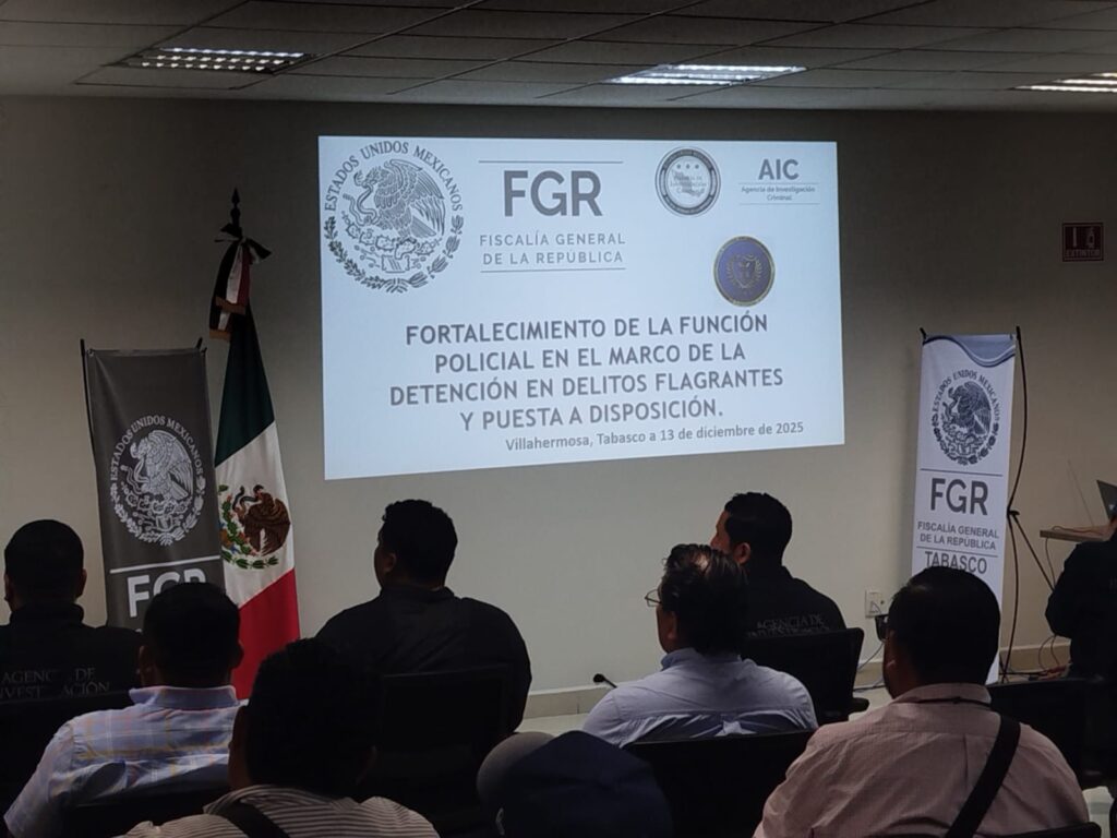 La Fiscalía General de la República (FGR) a través de su Fiscalía Especializada de Control Regional (FECOR) en el estado de Tabasco, en coordinación con la Mesa de Seguridad para la Construcción de la Paz en Tabasco, llevó a cabo la capacitación denominada “Fortalecimiento de la Función Policial en el Marco de la Detención y Puesta a Disposición en Delitos Flagrantes”, impartida a 10 elementos de la Policía Federal Ministerial y 40 elementos de la Policía de Investigación, adscritos a la Fiscalía General del Estado.