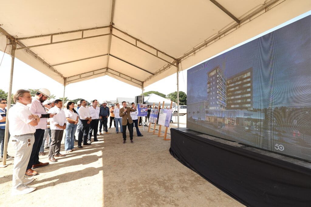 Acompañado por la secretaria de Turismo y Desarrollo Económico, Katia Ornelas Gil, y el director médico del Grupo Fifty Doctors, Jorge Marcos Martínez, el mandatario realizó un recorrido por las áreas que constituyen la primera etapa del nosocomio, que se ubicará en la zona residencial Villa Brisa.