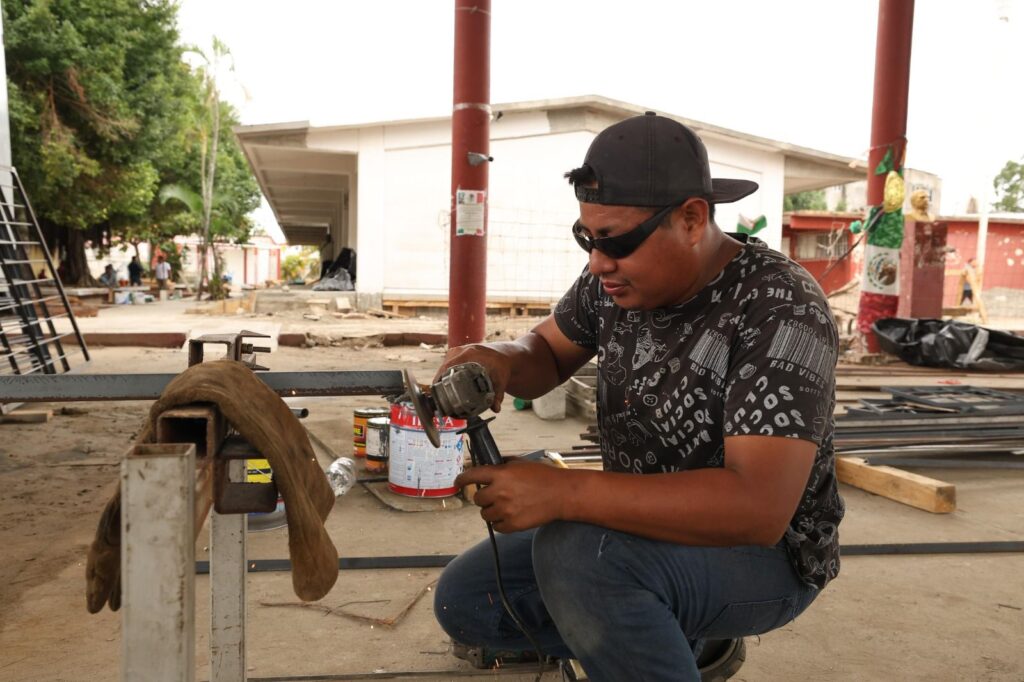 Los trabajos de reconstrucción de la secundaria, incluyen la construcción de la barda perimetral; suministro y colocación de loseta cerámica e impermeabilizante; refuerzo de acero en cadenas, castillos, trabes y losas; y la construcción de 120 metros cuadrados de concreto, banquetas y andadores, entre otros.