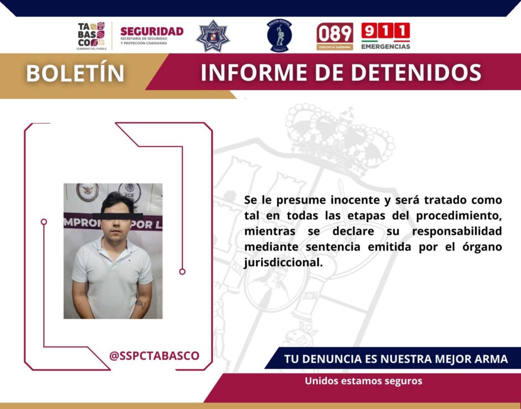 Como resultado de las acciones de seguridad, vigilancia y prevención del delito implementadas por la Secretaría de Seguridad y Protección Ciudadana (SSPC), en coordinación con la Fuerza Interinstitucional de Reacción Táctica (FIRT) Olmeca, lograron la detención de una persona del sexo masculino que conducía un vehículo con reporte de robo.
