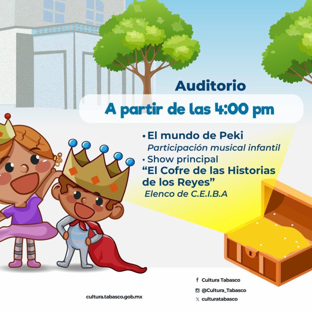 La jornada concluirá en el Auditorio, a partir de las 4:00 de la tarde, con la participación musical infantil “El mundo de Peki” y el espectáculo principal “El Cofre de las Historias de los Reyes”, a cargo del elenco de C.E.I.B.A, combinando música, narrativa y teatro para toda la familia.