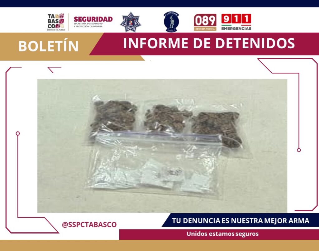 Durante un operativo de vigilancia y prevención, elementos de la Fuerza Interinstitucional de Reacción Táctica (FIRT) Olmeca, integrada por la Secretaría de Seguridad y Protección Ciudadana de Tabasco, lograron la detención de un hombre por presunta posesión de drogas.
