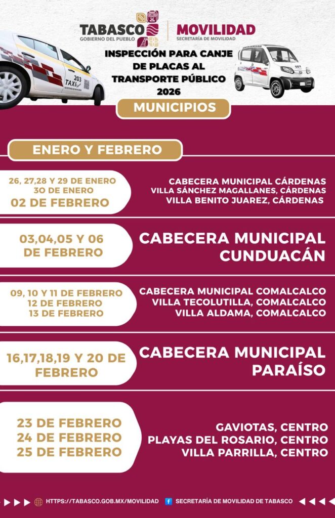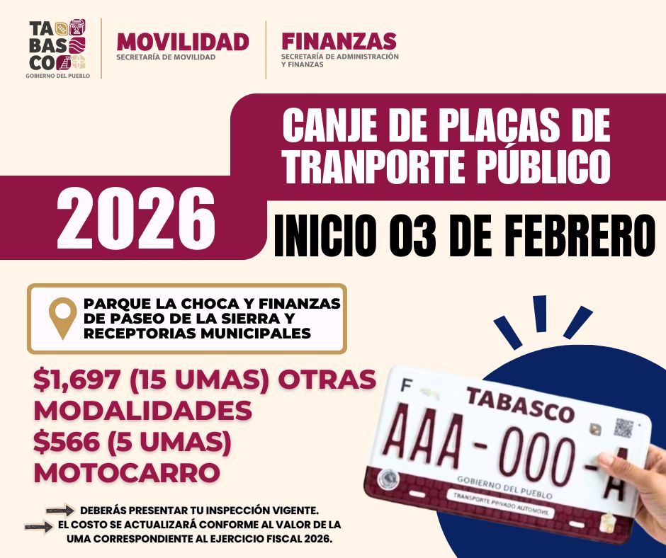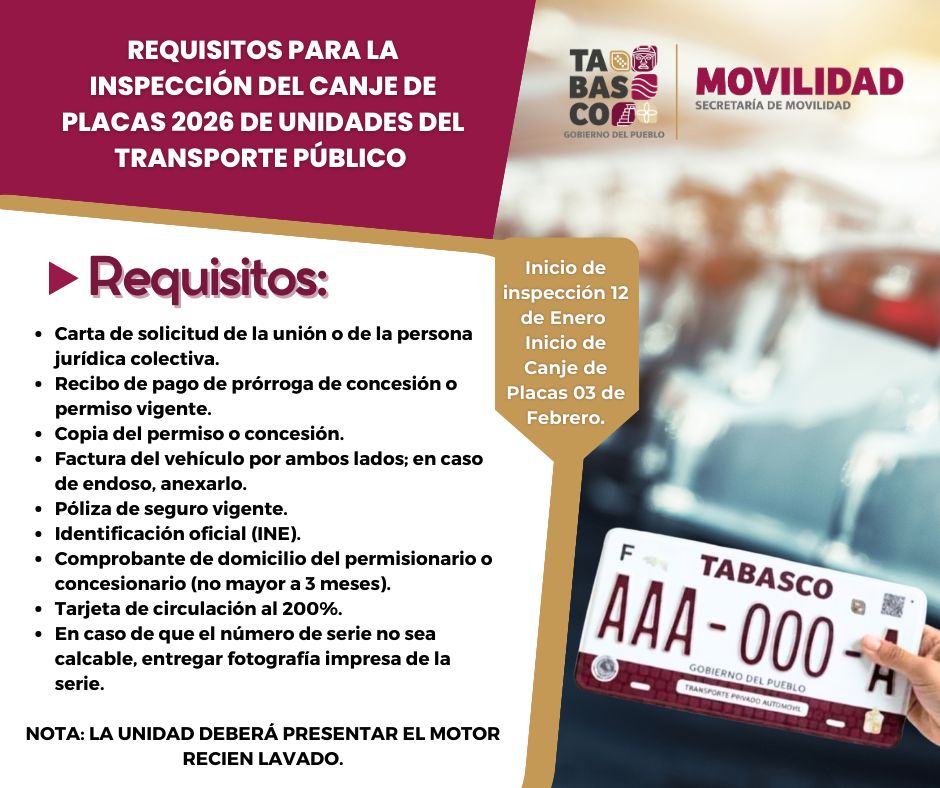 Para actualizar y modernizar el padrón vehicular del Estado que garantice la seguridad y eficiencia del servicio a las y los tabasqueños, el Gobierno del Pueblo a través de la Secretaría de Movilidad (Semovi) de Tabasco dará inicio, a partir del lunes 12 de enero, a la inspección física y documental para el canje de placas de transporte público, así lo dio a conocer su titular, Rafael Elías Sánchez Cabrales.