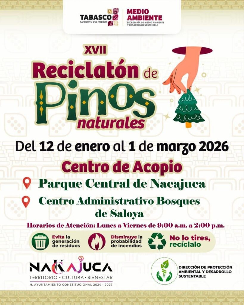 Con el objetivo de reducir residuos, prevenir incendios y fomentar la cultura del reciclaje, la Secretaría de Medio Ambiente y Desarrollo Sostenible de Tabasco, en coordinación con el H. Ayuntamiento de Nacajuca, lleva a cabo el XVII Reciclatón de Pinos Naturales.