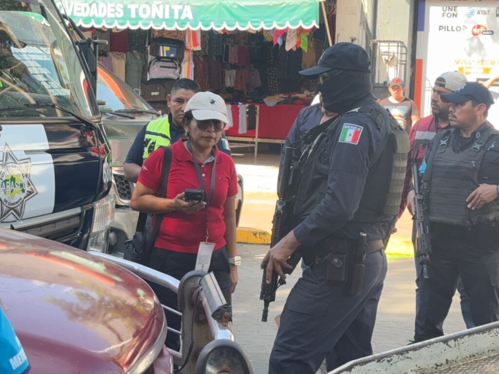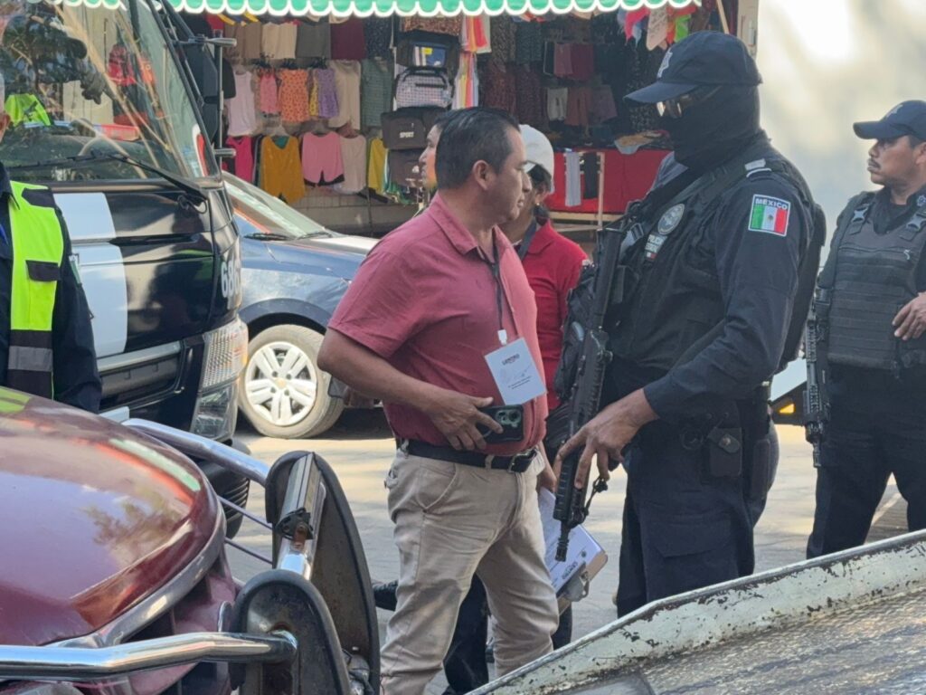 Al menos 35 elementos de la Policía Estatal, 15 de Fiscalización, dos grúas de la PEC, tres motocicletas y personal de la Policía Preventiva participaron en un operativo de vialidades libres en el mercado público José María Pino Suárez.