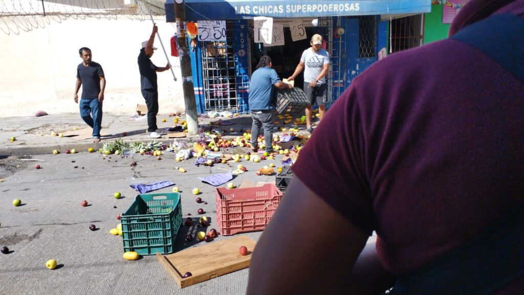 Durante la acción se detuvo una camioneta que distribuía frutas y verduras a puestos ambulantes. Comerciantes de la zona expresaron su descontento, señalando pérdidas superiores a 30 mil pesos cada uno, mientras que en el suelo quedaron frutas en buen estado que fueron arrojadas durante el operativo.