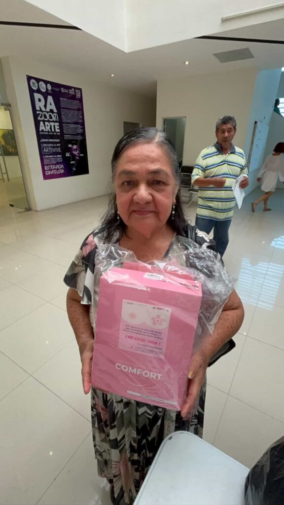 Durante la jornada también se realizó la entrega de dos prótesis de mama externa y brasieres de tela suave. La señora Mercedes Olán Sánchez, beneficiaria de este apoyo, relató que haber enfrentado el cáncer de mama no ha sido un proceso sencillo, aunque hoy se considera una sobreviviente gracias al seguimiento médico recibido.