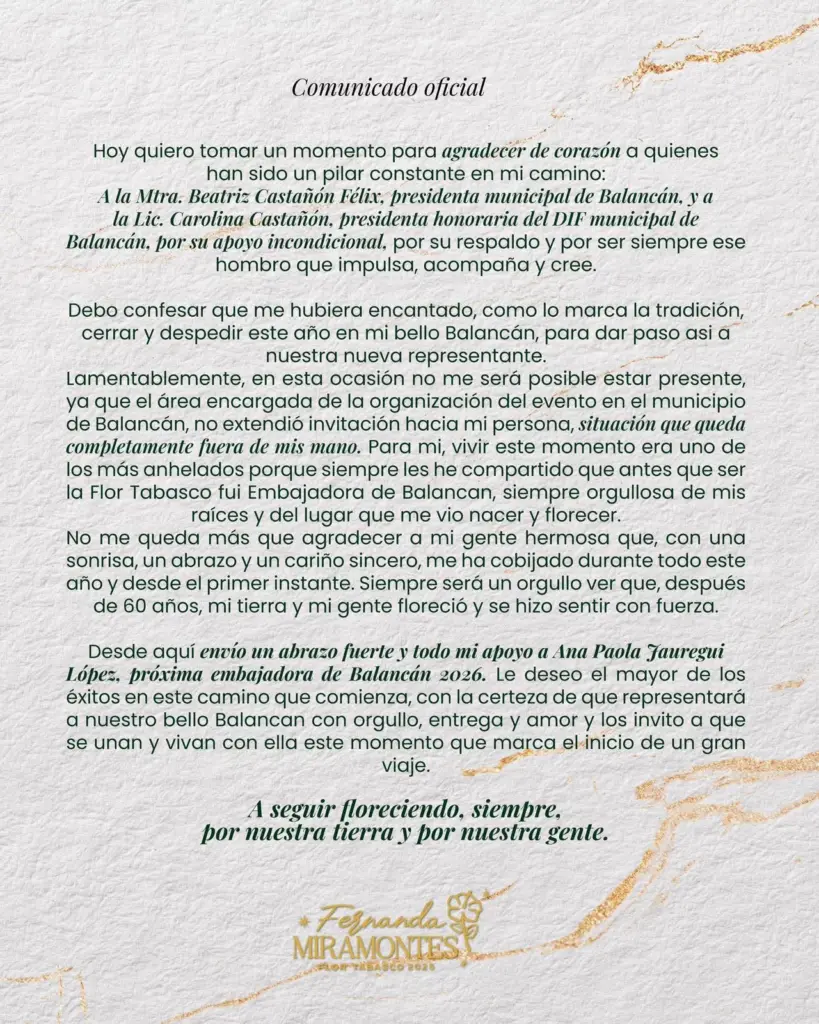 A través de un comunicado oficial, Fernanda Miramontes, Flor Tabasco 2023, expresó su profunda decepción por no haber sido invitada al tradicional evento de cierre de ciclo en su municipio natal, Balancán, donde se presenta a la nueva embajadora rumbo a la Feria Tabasco.