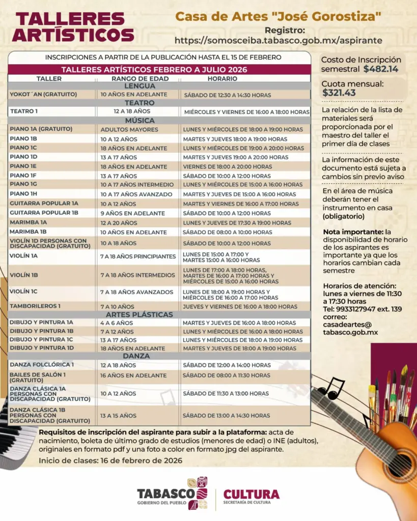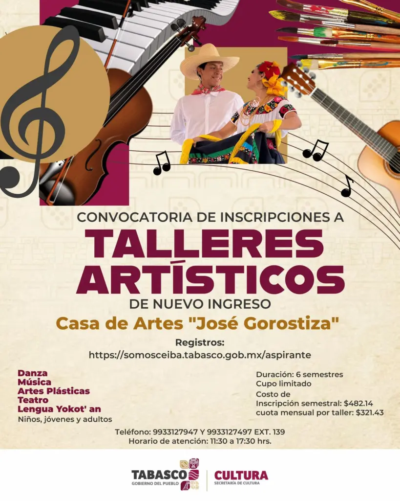 La Secretaría de Cultura de Tabasco abrió la convocatoria de inscripciones a los Talleres Artísticos de nuevo ingreso, que se impartirán de febrero a julio de 2026 en la Casa de Artes José Gorostiza, dirigidos a niñas, niños, jóvenes y adultos.