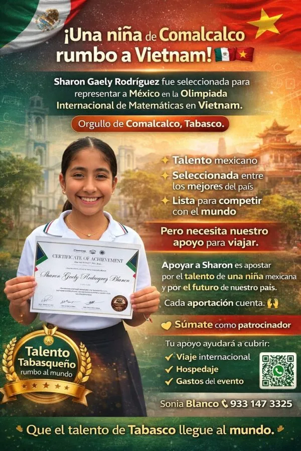 La menor Sharon Gaely Rodríguez Blanco, de 12 años y originaria de Comalcalco, fue seleccionada para representar a México en la Olimpiada Internacional de Matemáticas que se realizará del 5 al 8 de marzo en la ciudad de Đà Lạt, Vietnam; sin embargo, su familia solicita respaldo económico para que pueda concretar el viaje.