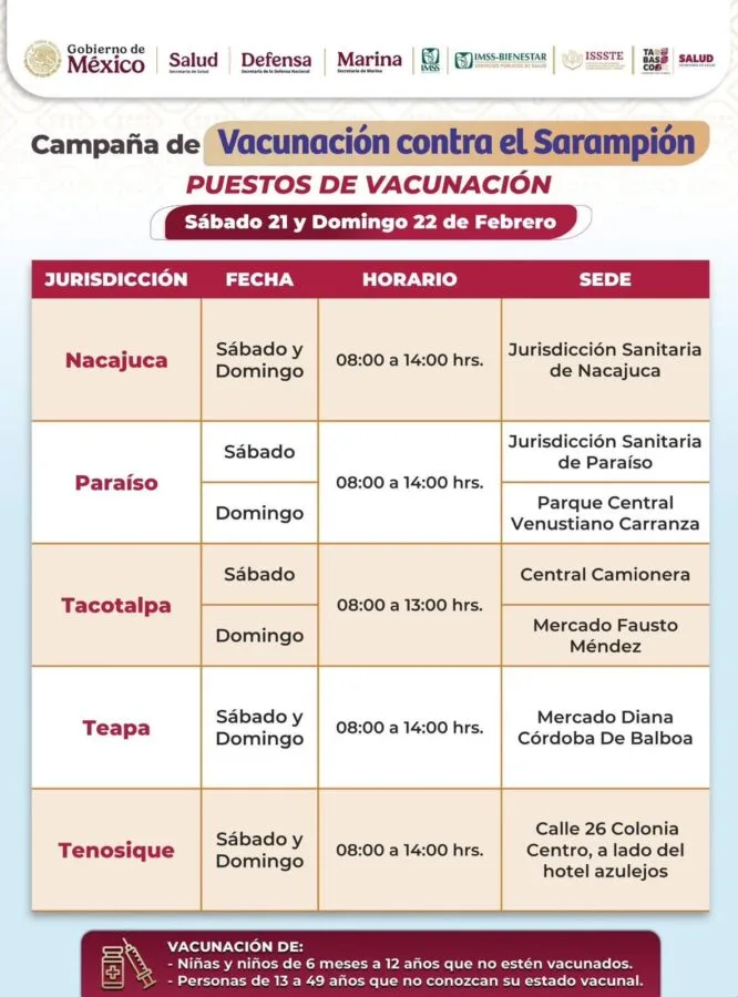 Como parte de la Campaña de Vacunación contra el Sarampión, autoridades de la Jurisdicción Sanitaria de Nacajuca mantienen activos módulos de atención en distintos municipios del estado, con el objetivo de proteger a la población y prevenir brotes de esta enfermedad altamente contagiosa.