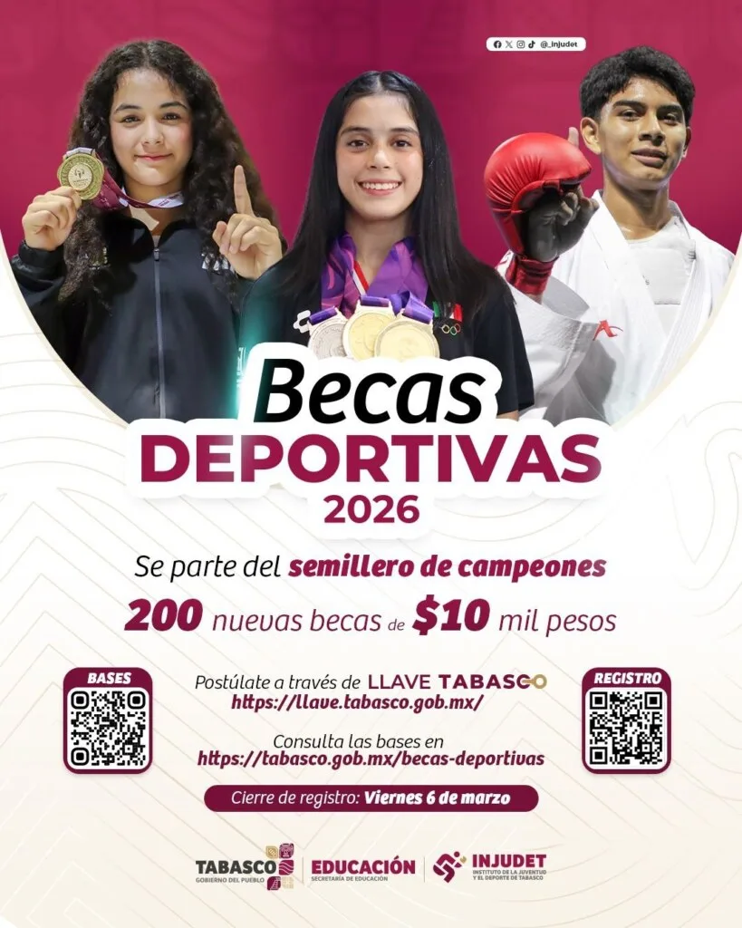 Para consolidar el talento local y fortalecer el alto rendimiento en la entidad, el Gobierno del Estado de Tabasco y la Secretaría de Educación a través del Instituto de la Juventud y el Deporte (INJUDET), abrió este martes oficialmente la Convocatoria de Becas Deportivas 2026.