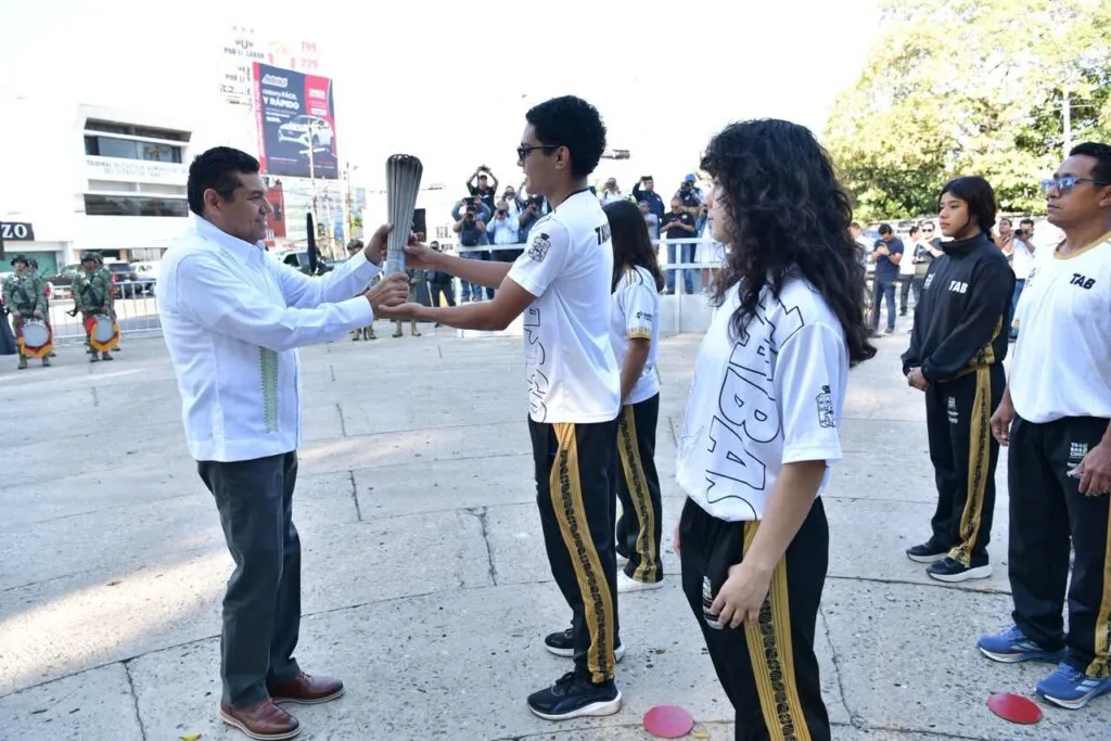 Momentos antes jóvenes estudiantes tabasqueños hicieron entrega de una antorcha simbólica al mandatario estatal y este a su vez hizo el encendido del pebetero, un acto que representa la vigencia del espíritu patriótico de los héroes que expulsaron a las tropas extranjeras del territorio estatal.