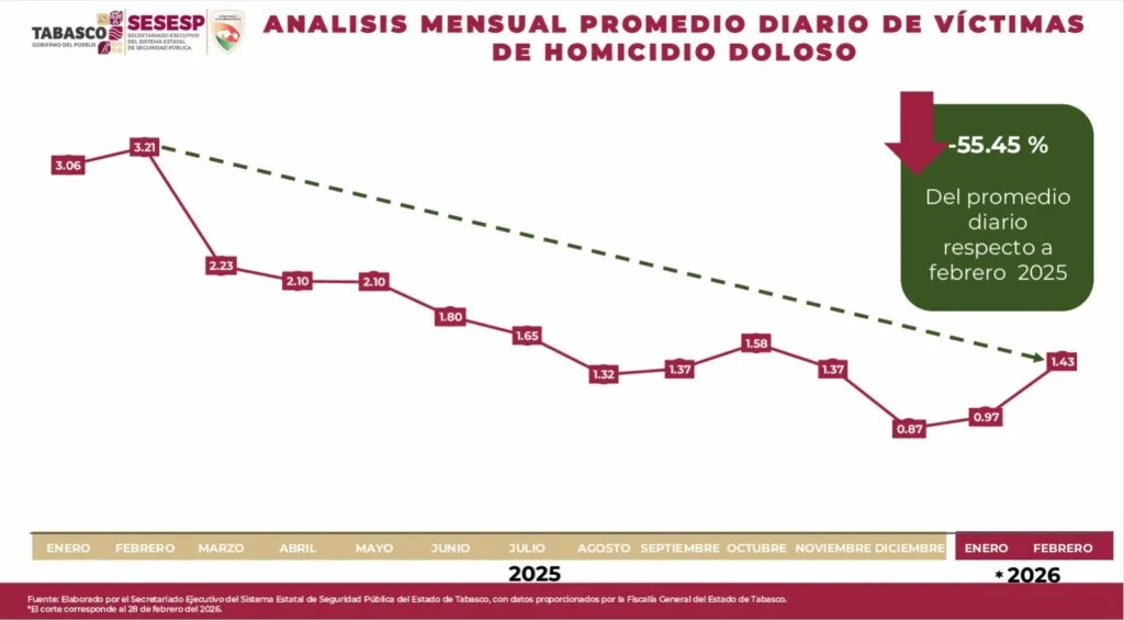 Aseveró que, en el análisis mes a mes, “se pasó de una tasa de 3.21 homicidios dolosos diarios en el estado a 1.43 en el mes de febrero, manteniendo una disminución del 55.45 promedio diario”.